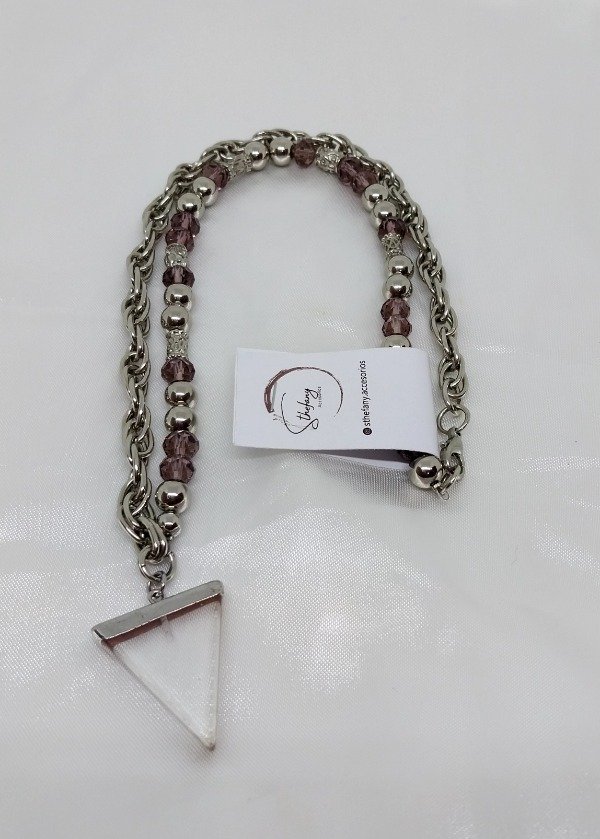 collar realizado con cadena de acero quirurgico, cuentas de metal zamak, cristal de rica y dije triangulo cristalino.