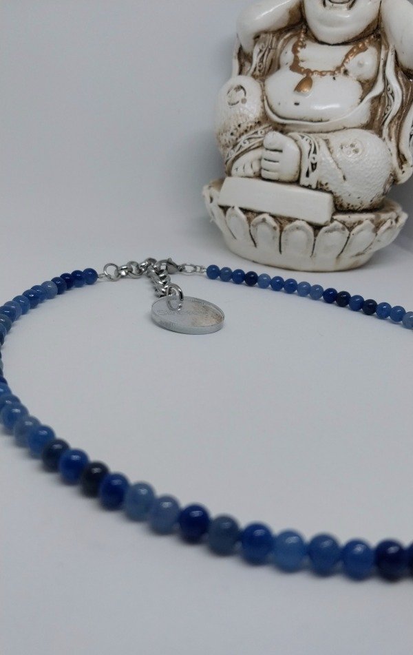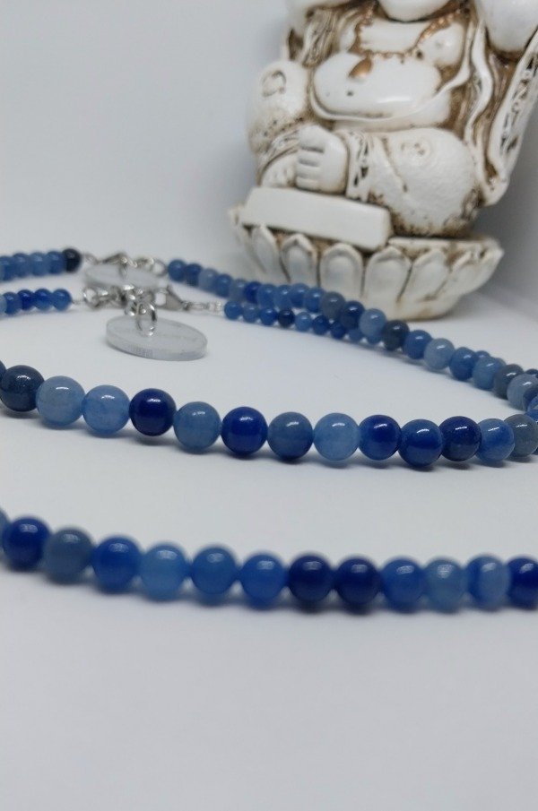 Collar realizado con piedras minerales naturales CUARZO AZUL DE 6MM.Mide 38cm de largo más 6cm de cadena de alargue de acero quirúrgico hipoalergenico.