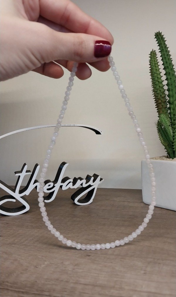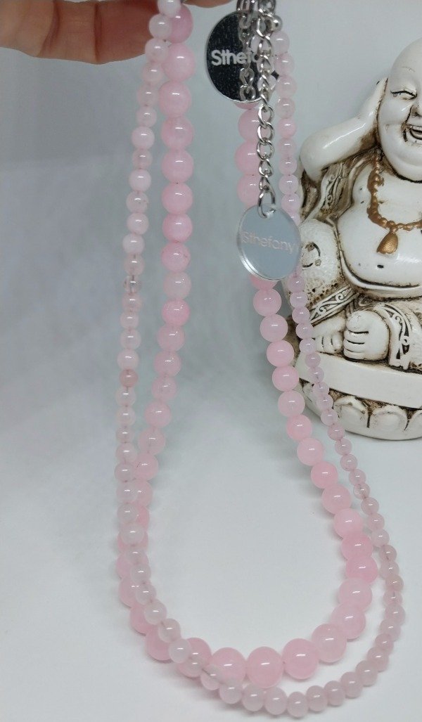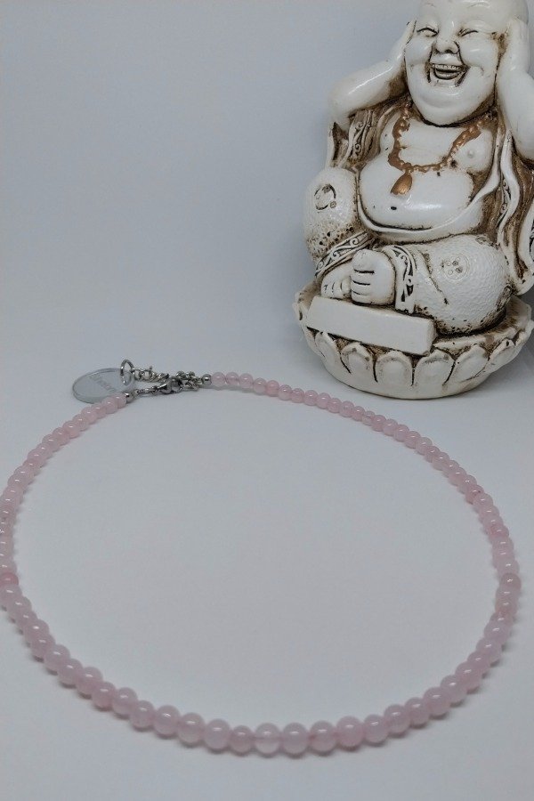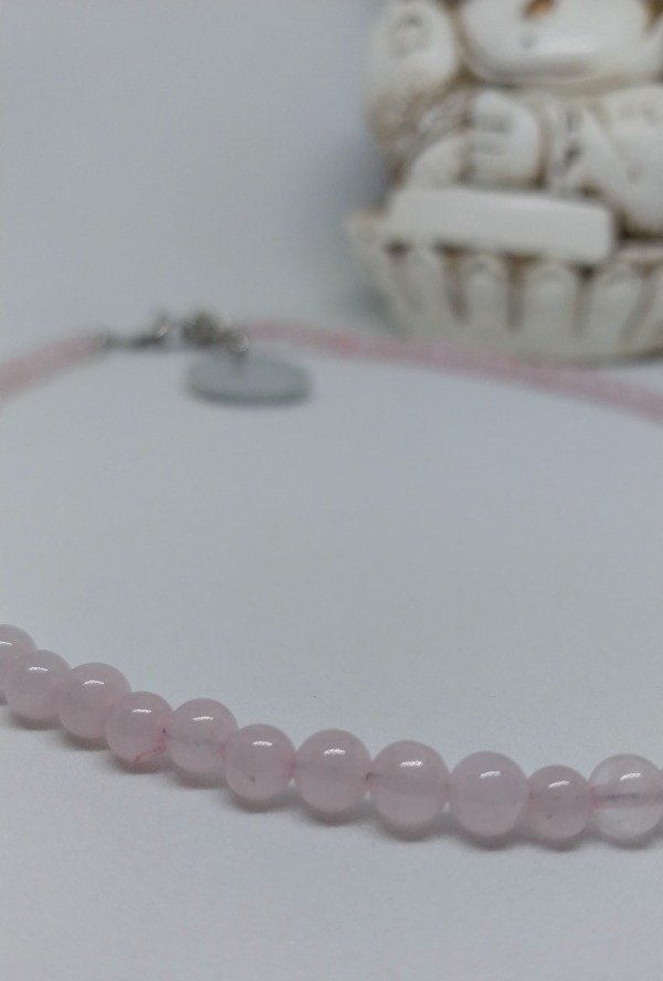 Collar realizado en piedras minerales naturales CUARZO ROSA DE 4MM.Mide 38cm de largo más 6cm de cadena de alargue de acero quirúrgico hipoalergenico.