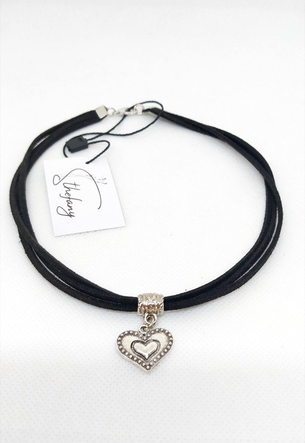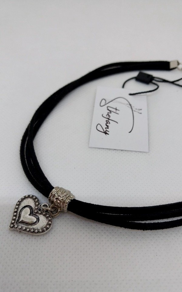 Collar al cuello realizado en gamuza con cierre mosqueton y dije metálico.