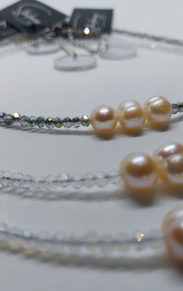 Collar microcristal con perlas de río natural, cierre,cadena y marca de acero quirúrgico.consuktar color disponible al momento de la compra.